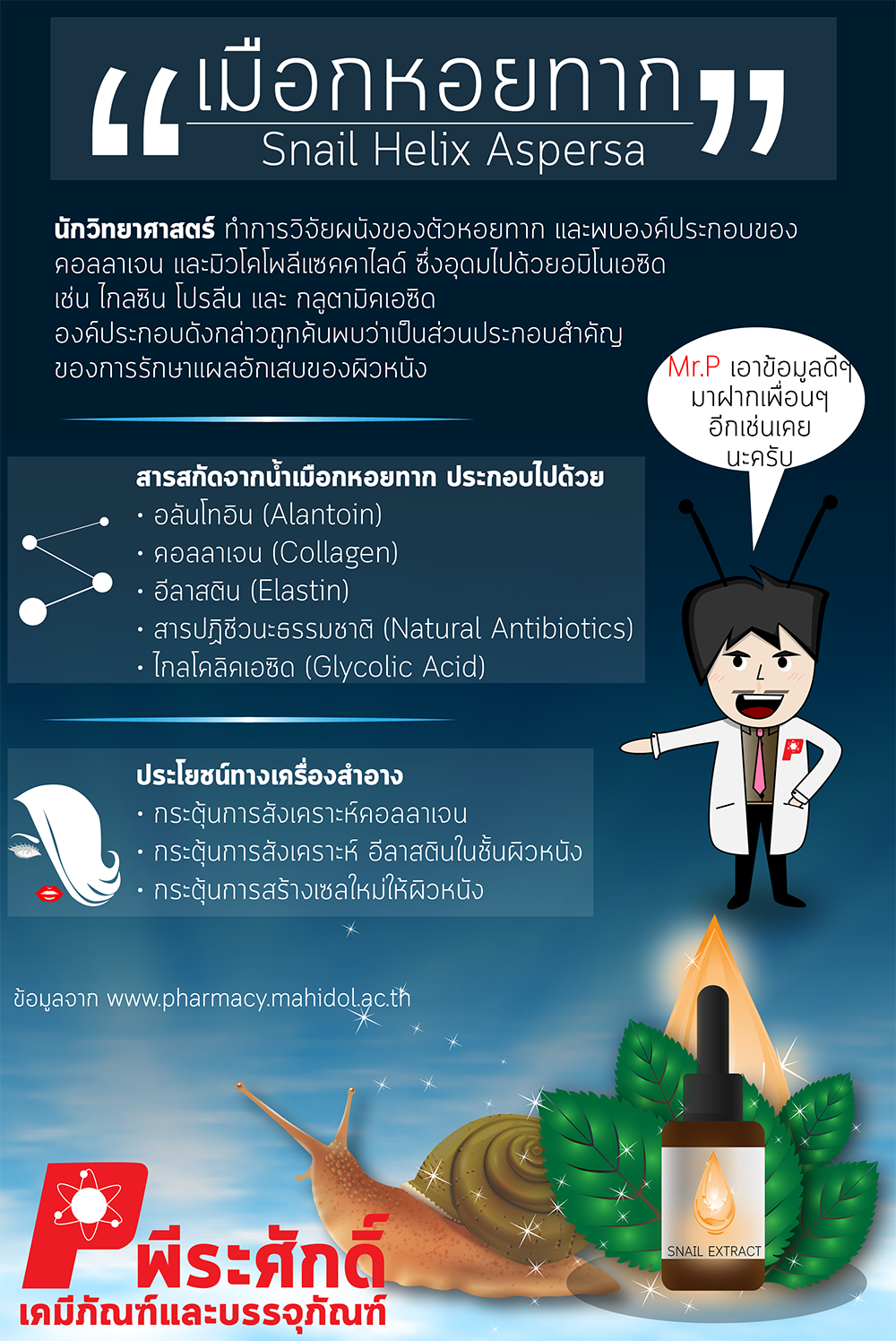 คำนำ น้ำเมือกที่ปกคลุมตัวหอยทาก (Snail Helix Aspersa) มีคุณสมบัติมากมายซ้อนอยู่ มีการนำมาใช้ประโยชน์ทางการแพทย์ตั้งแต่สมัยกรีกโบราณ เพื่อลดอาการอักเสบของผิวหนังนักวิทยาศาสตร์ได้ให้ความสนใจการการเคลื่อนที่ของหอยทากในธรรมชาติ การเคลือบคลานของตัวหอยทากบนพื้นดินหรือพื้นหินที่ขรุขระและหยาบโดยไม่ทำให้หอยทากบาดเจ็บแม้แต่น้อย และยังสามารถต้านฝุ่นละอองและเชื้อจุลินทรีย์ในสภาวะต่างๆได้ด้วย